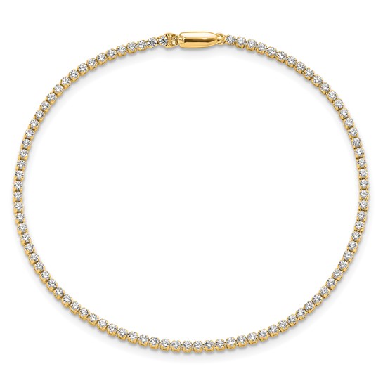 The solid yellow or white gold delivers a sleek tone that accentuates the icy glow of G+ color-grade stones, while the box catch clasp ensures security without sacrificing elegance. At 7 inches in length and 1.8 mm in width, it’s a whisper-thin strand of radiance that speaks volumes.