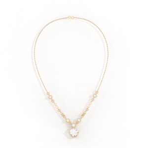 Suspended from a 14–22 inch adjustable chain adorned with bezel-set round diamonds, this necklace offers both versatility and radiance. The secure fastening ensures comfort and confidence with every wear, while the floating design gives the center stone an almost ethereal presence.