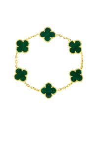 Slip into elegance with this 18k yellow gold bracelet, where bold geometry meets lush green seduction. Five striking 15 mm natural malachite stones—each with its own hypnotic swirl of deep emerald and velvety striation—are set in warm golden frames that dance with the light. The geometric shapes create a modern edge while the malachite’s rich, mysterious hues whisper timeless allure. Designed to turn a simple wrist into a statement of confidence and desire, this bracelet isn’t just jewelry—it’s wearable art that commands attention with every glance.